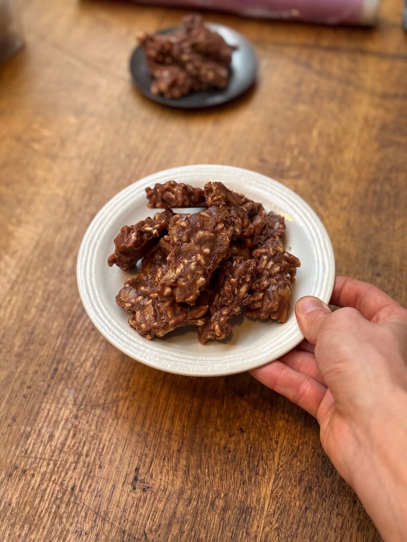 Meng voorzichtig de gepofte rijst door het chocolademengsel.